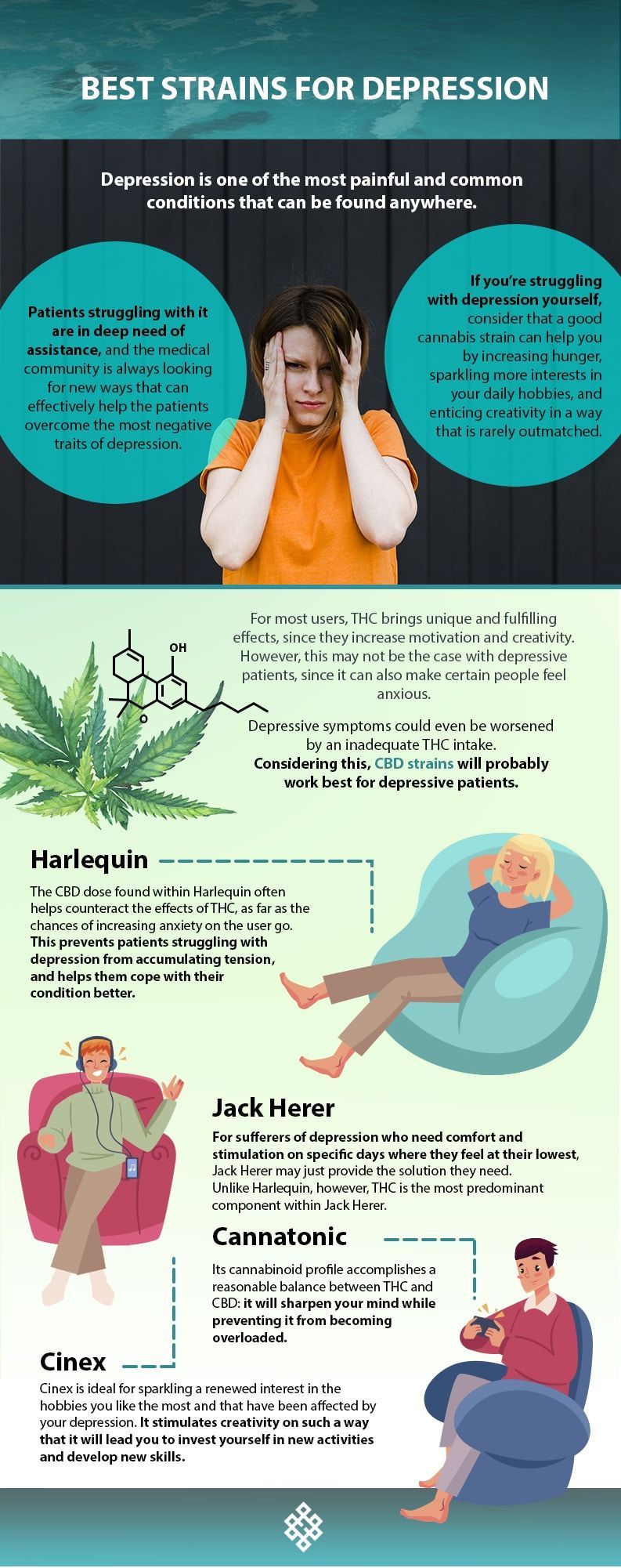 Harlequin This strain is one of the most widely used by depressive patients. Its composition features a reasonable balance between THC and CBD, which delivers clear-headedness along with an effective and deep sense of relief. The primary terpenes that work in Harlequin are myrcene, caryophyllene and pinene. The CBD dose found within Harlequin often helps counteract the effects of THC, as far as the chances of increasing anxiety on the user go. This prevents patients struggling with depression from accumulating tension, and helps them cope with their condition better. Jack Herer In the cannabis industry, the Jack Herer strain is often associated with joy and a spark in creativity. It is often referred as the go-to strain for uplifting effects. Its terpenes, which are terpinolene, pinene and caryophyllene, have a distinct sharp pine and freshly cut wood scent. For sufferers of depression who need comfort and stimulation on specific days where they feel at their lowest, Jack Herer may just provide the solution they need. Unlike Harlequin, however, THC is the most predominant component within Jack Herer. This means that users who are prone to developing anxiety will probably be better off with a strain that has a stronger CBD presence.