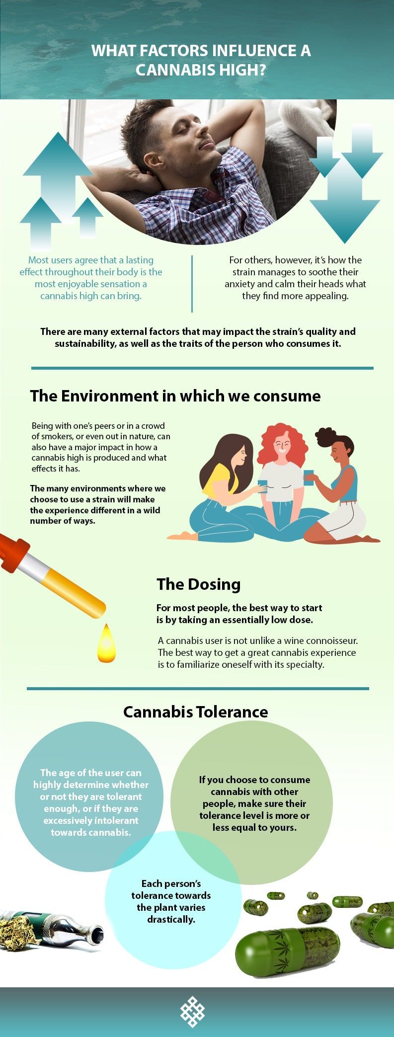 This is perhaps the most personal factor that can influence a cannabis high. Each person's tolerance towards the plant varies drastically. Because of this, finding that specific strain that works best for you is considered as much influenced by inner factors as it is from outside factors.