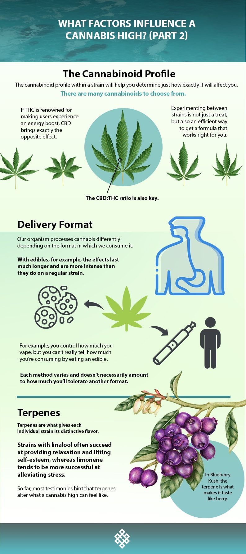 Becoming familiar with what makes a cannabis compound work its magic also means going through the tiny ingredients, such as terpenes, and appreciating their individual properties. Understanding what makes a cannabinoid profile work will separate a good user from an amateur, and telling a delivery method from another will prevent an unwanted overdose. Knowing these will make a huge difference, and enable you to find what you're looking for faster. So, without further ado, let's take a close look at some of the most influential factors that can make a cannabis high a superb time or a regrettable downer.